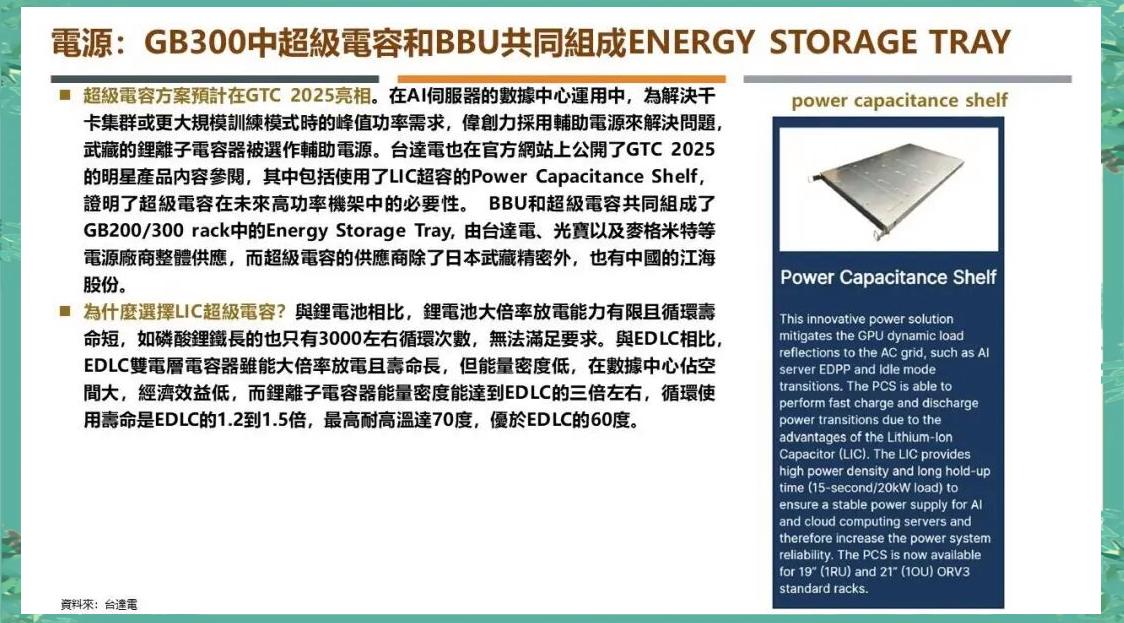 英伟达推出的电源方案采用48V高压直流技术,与氮化镓(GaN)功率器件相结合,大幅提高了转换效率,达到了97.2%,并降低了供电损耗。同时,该方案首次使用“超级电容+锂电BBU”的混合储能模块,能够满足GPU的高功率需求,这种创新已成功应用于橡树岭国家实验室的超算项目中。